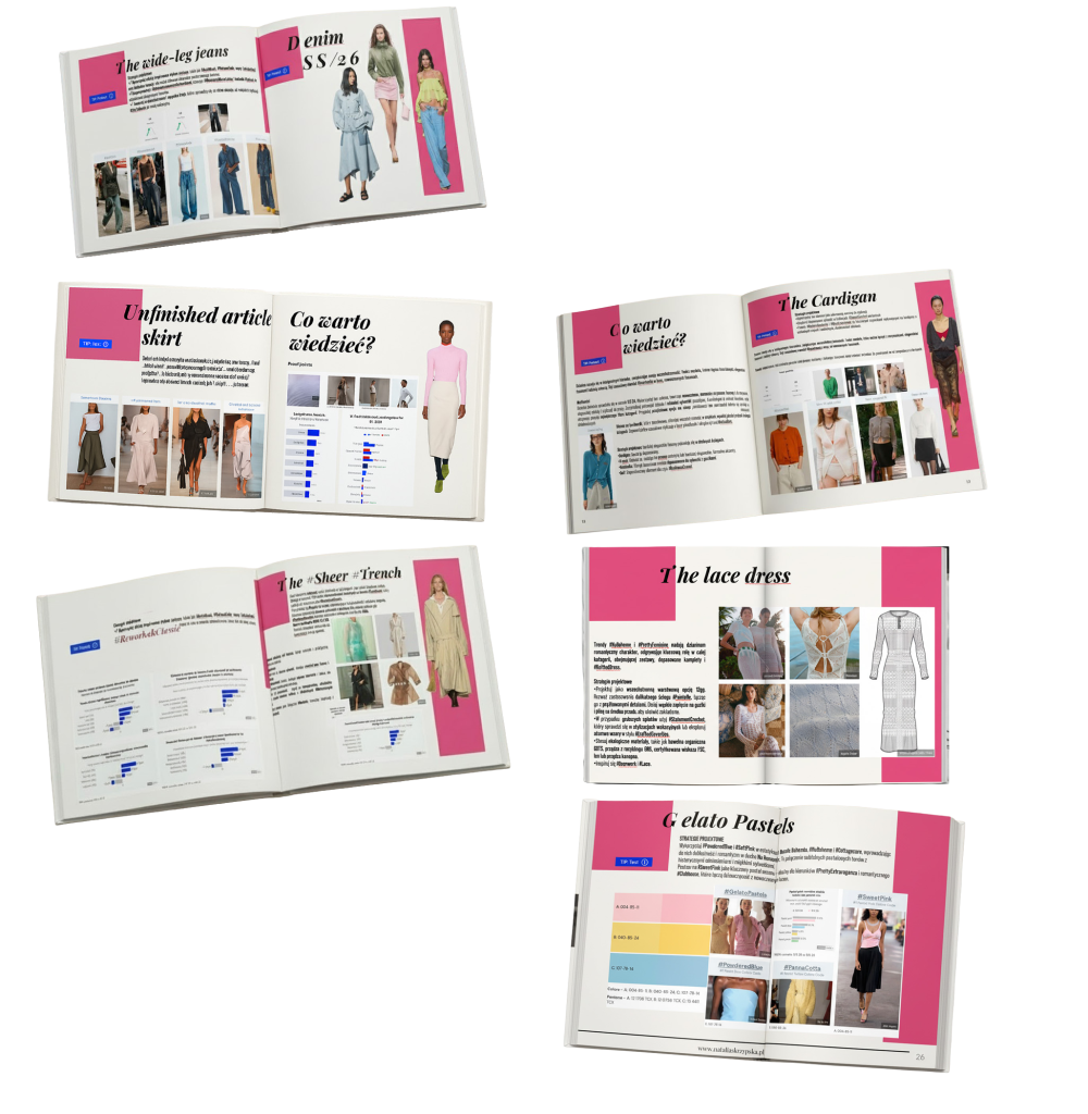 Dzięki temu możesz wykorzystać treści trendbooków nie tylko podczas planowania kolekcji, ale również w komunikacji wizualnej marki, przy tworzeniu moodboardów czy materiałów marketingowych.